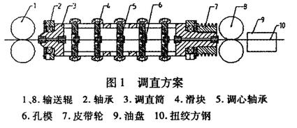 由于扭絞方鋼是通過拉絲機拉拔出來呈盤圓狀的 ,無法自身旋轉 。因此 ,我們采用滾筒式調直是唯一的辦法 。而目前 ,多數廠家均采用在滾筒內排列若干個輥子 ,然后通過調節輥子對線材壓力 , 以達到消除應力目的 。但是 , 因為輥子的硬度一般都在 58 ~ 62HRC ,這樣就很容易令扭絞方鋼出現表面劃傷 , 而且方鋼圓弧角也會被磨損 ; 但如果降低輥子的硬度 , 輥子又會很快被方鋼“切出 ”一條槽 ,起不到壓力調直的作用 。 圖 1 調直方案 1、8. 輸送輥 2. 軸承 3. 調直筒 4. 滑塊 5. 調心軸承 6. 孔模 7. 皮帶輪 9. 油盤 10. 扭絞方鋼 為此 ,如圖 1 所示 。我們采用孔模 6 代替原來的 調直輥 ,裝在調直滾筒 3 中 ,以期達到消除摩擦 ,并避免方鋼劃傷和圓弧角被磨損的目的 。孔模 6 安裝在 調心軸承 2 內 ,被調直的方鋼 10 從中間穿過 ,軸承 2 裝在位臵可以調節的滑塊 4 內 。在調直時將滑塊 4 調成交錯壓彎 ,而各個孔模 6 形成相互偏心狀態 , 其偏心大小代表壓彎量的不同 ?啄 6 的偏心隨著調直筒的轉動而繞著扭絞方鋼 10 軸線旋轉 , 使扭絞方鋼 10 在前進過程中各個方向受到多次彈性彎曲 , 從而最終達到調直的目的 。而且 ,我們還在滾筒的入口處增加潤滑油盤 9 ,使扭絞方鋼在進入調直時表面就有潤滑油 ,而且得到充分潤滑 。