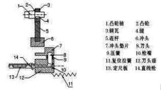 扭絞方鋼調直后需切斷成客戶要求的長度。切斷過程由安裝在方鋼出口處的切斷機來完成 ,切斷機由偏心機構 (如圖 2 中 1 ~6 部件 ) 和切斷機構 (如圖 2 中 7~14 部件 )組成 。動力為切斷電機 ,通過皮帶傳動使凸輪軸 1 旋轉 ,而沖頭 6 在凸輪 2 的作用下作上下往復運動 。工作時 ,當扭絞方鋼在達到定長時 , 即線材頂住定尺板 13 ,由于線材在輸送輥的作用下繼續前進 ,就將直線槍 14 向前推動 ,刀頭頂部的沖頭墊片 7 凸臺就會移動到沖頭 6 的工作行程內 ,此時通過沖頭墊片 7 沖擊刀頭 8 ,從而切斷到標準長度的扭絞方鋼 。當方鋼自行落下后 , 在復位拉簧 11 的作用下使切斷機構回復到初始狀態 ,進入下一個循環 。