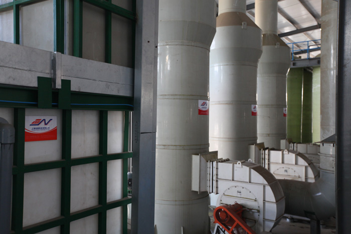 本裝置采用氫氧化鈉溶液為吸收中和液來凈化酸霧廢氣。 氣體由離心通風機壓入或吸入進風段,先由上向下, 然后再由下向上流動, 經過第一級濾料層, 與第一級噴淋中和液接觸反應。 吸收后的廢氣繼續向上流動至第二級噴咀噴出的中和液接觸 , 再次發生中和反應, 然后通過旋流板,由風帽和排風管排入大氣中。 吸收塔中的吸收液采用為的溶液 。由于吸收液循環使用, 在過程中濃度不斷降低,當吸收液濃度低于2%時補加NaOH至6%,在吸收液中的鹽濃度大于20%時 需進行吸收液更換。