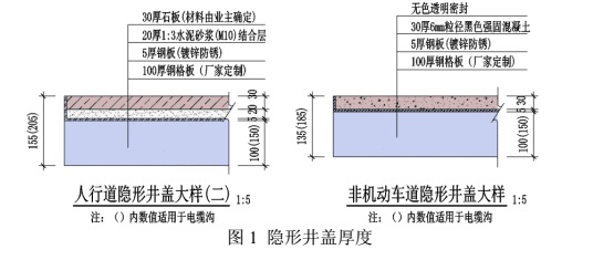 待混凝土初凝后,即可安裝隱形蓋板,并在隱形蓋板四周設(shè)置8mm厚鋼板,與預(yù)埋鋼板焊接,固定隱形蓋板位置。人行道上隱形井蓋鋪裝層采用2cm厚1:3水泥砂漿(M10)結(jié)合層貼3cm厚花崗巖石材(石材與井蓋周邊人行道一致),非機(jī)動(dòng)車道隱形井蓋鋪裝層采用3cm后6mm粒徑黑色強(qiáng)固混凝土并用無色透明密封,詳見圖。隱形井蓋鋪裝層應(yīng)與井蓋周邊路面順接相平。