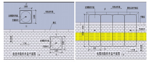 人行道上的隱形井蓋面層鋪裝和人行道面磚鋪裝材料一致,遇到盲道磚應(yīng)與之順接,隱形井蓋橫跨非機(jī)動(dòng)車道和人行道時(shí),在隱形井蓋周邊加鋪一圈黑色平緣石,道路人行道鋪裝結(jié)構(gòu)形式順接原人行道。