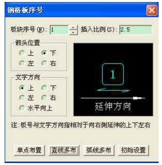 1 單擊菜單命令--標注板號,或輸入命令GGB,彈出鋼格板序號對話框,其中包括:序號內容,縮放比例,箭頭位置,文字方向,三種繪制序號的方式按鈕以及初始設置。如圖