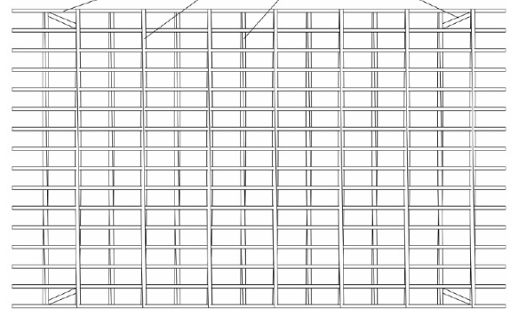 現有鋼格板的基本結構是:若干均勻排列扁鋼的上表面焊接若干均勻排列的上橫桿,形成若干方格狀的平板結構。大量應用在鋼結構工程的平臺鋪板、市政井蓋和水溝的蓋板等場合。由于這種鋼格板僅在上表面上焊接橫桿,各扁鋼在下表面之間缺少結構性的聯系,導致整體的剛度和強度不足,在長期汽車碾壓等交變載荷的作用下,特別是當扁鋼寬度較大時,容易發生承載扁鋼下部向側面傾倒,從而導致局部失穩、橫桿脫落等。