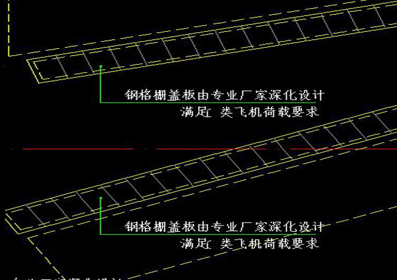 報據鋼筋混凝土蓋板使用中掉邊掉角的教訓.決定采用鋼格板.考慮到飛機輪碾壓力較大對邊角的剪拉作用較大.并考慮到經濟和施工的可能性.決定采用重型鋼格板.