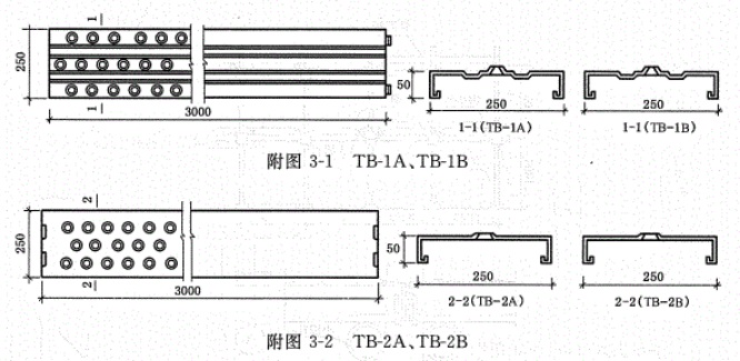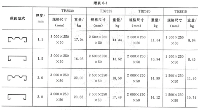 第2.0.3條按制作、防滑性能(見附錄二)及承載能力等條件,采用翻邊圓孔的鋼跳板,其型式為TB-1A、TB-1B、TB-2A和TB-2B等四種規(guī)格,板型如附錄三所示。
