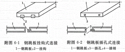 第4.0.3條鋼跳板要滿鋪、鋪平、鋪穩(wěn),從腳手架一端逐塊按順序鋪設(shè),腳手架兩端的鋼跳板必須與腳手架小橫桿固定。平道和斜道上的鋼跳板,如果采用掛鉤式或插孔式(如附錄六所示)的鋼跳板,每間隔一塊要與腳手架小橫桿固定,即采用彎鉤式連接件(如附錄六所示)或采用其他型式連接件;如采用U型卡連接件的鋼跳板((如附錄六所示),每間隔15m左右與腳手架小橫桿固定。鋼跳板鋪設(shè)完畢,經(jīng)檢查合格方可使用。